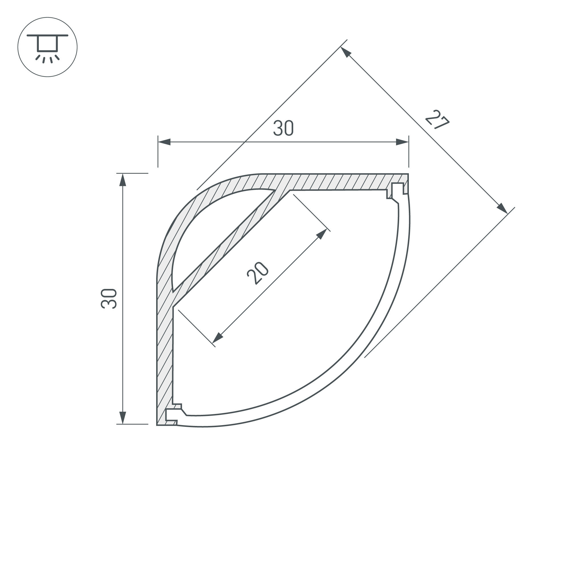 Алюминиевый анодированный угловой профиль для светодиодных лент и линеек. Габаритные размеры (L×W×H): 2000x30x30 мм. Ширина площадки для ленты 20 мм. Цена за комплект.