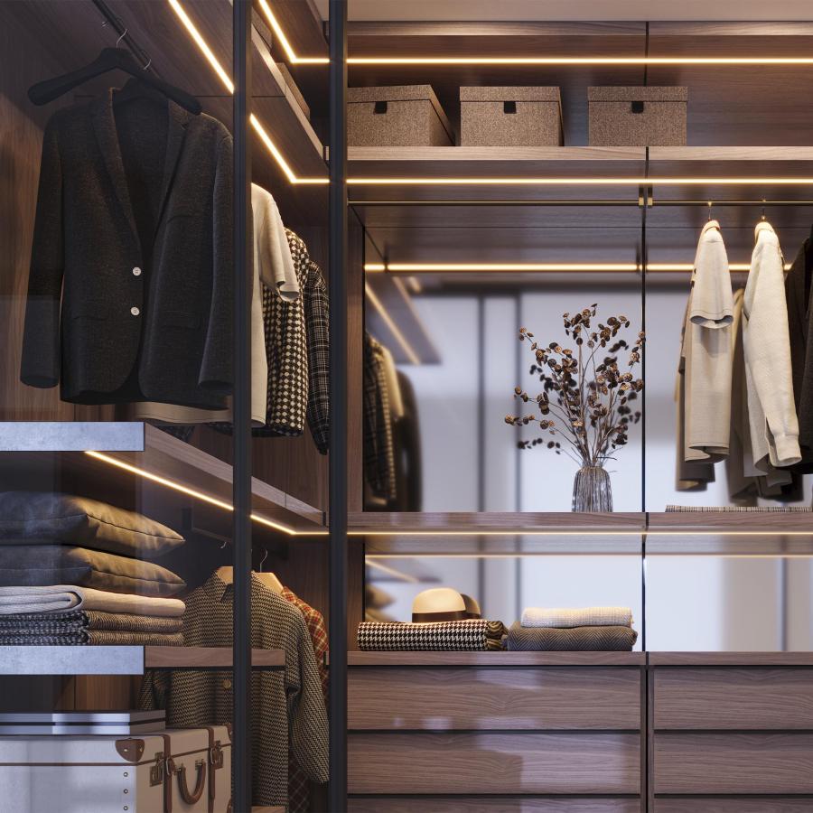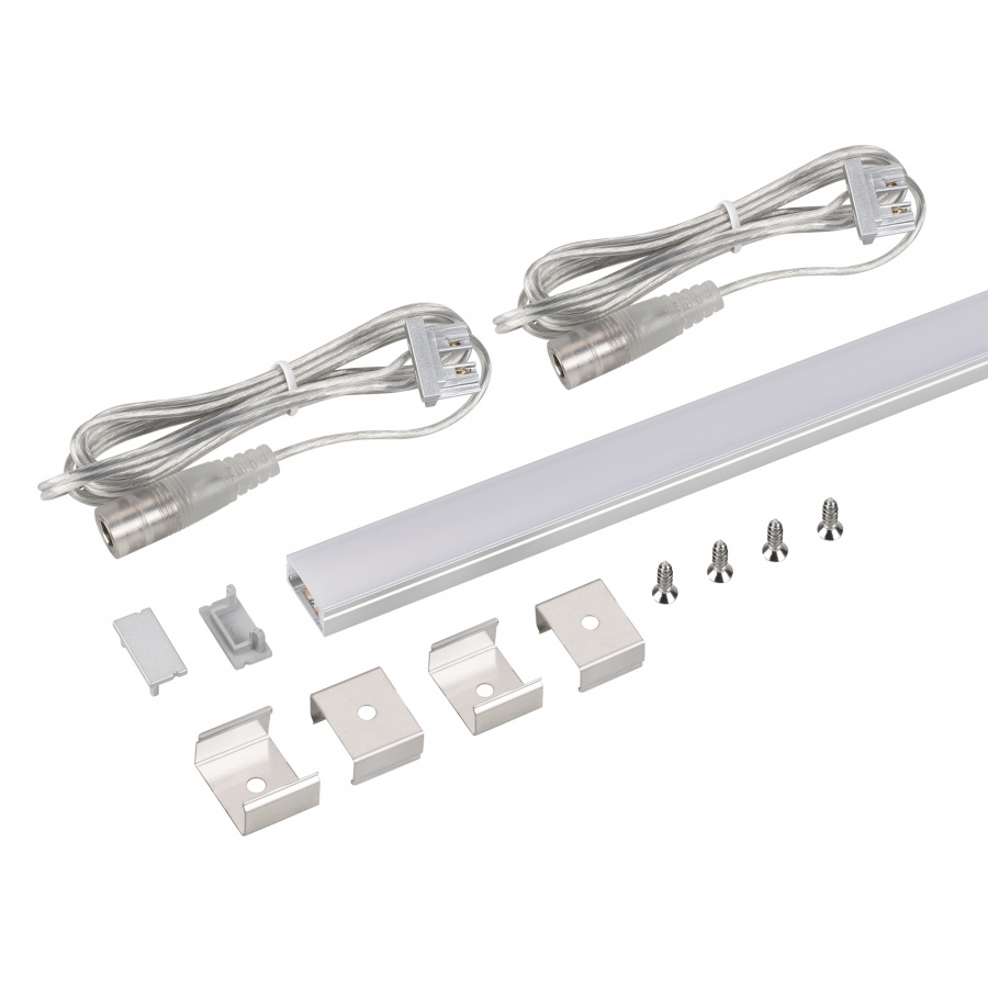 В комплект входят: алюминиевый анодированный профиль 2000 мм, матовый экран 2000 мм, пластиковые глухие заглушки - 2 шт., заглушки с кабелем 1 метр и разъёмом 5.5DC Female - 2 шт., металлические держатели - 4 шт., шурупы - 4шт., светодиодная лента FC-M200.