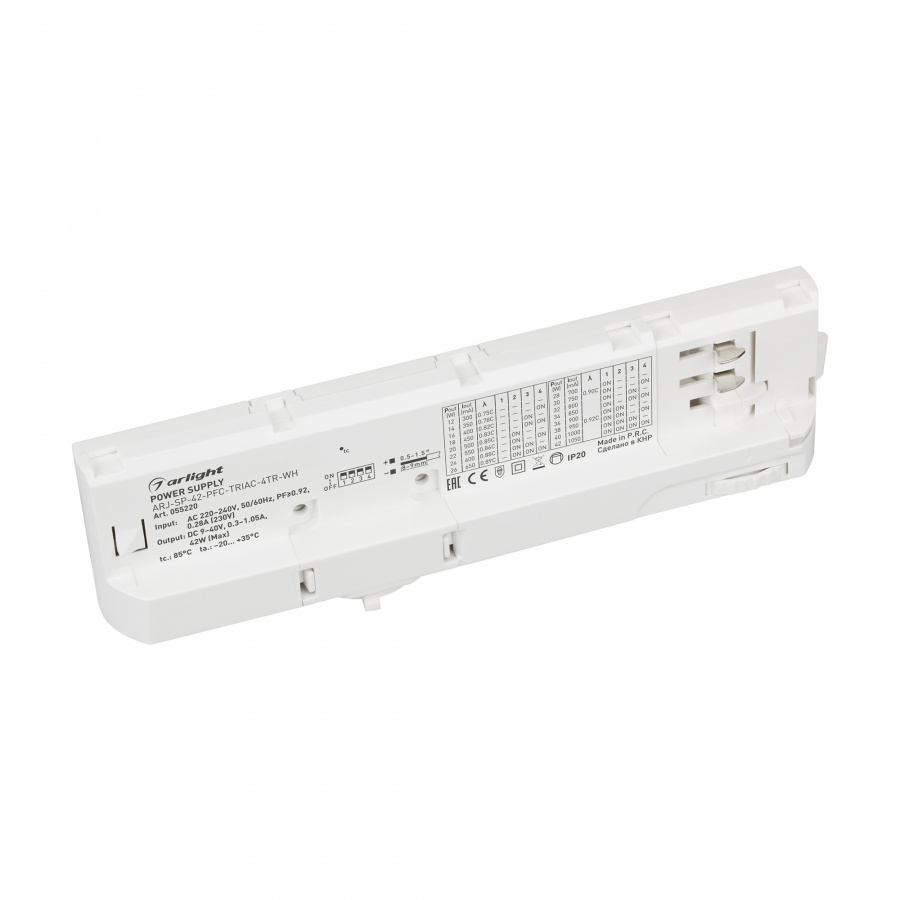 Цвет корпуса - белый. Предназначен для работы с 3-х фазной трековой системой (4+1 контакт). Питание 220-240VAC. Выходные параметры: 9-40В (300 - 1050мА), максимальная мощность 42 Вт. Активный корректор мощности. Глубина диммирования 1-100% Пластиковый корпус IP20. Габаритные длина 158 мм ширина 31 мм. высота 45 мм.. Гарантия 5 лет.