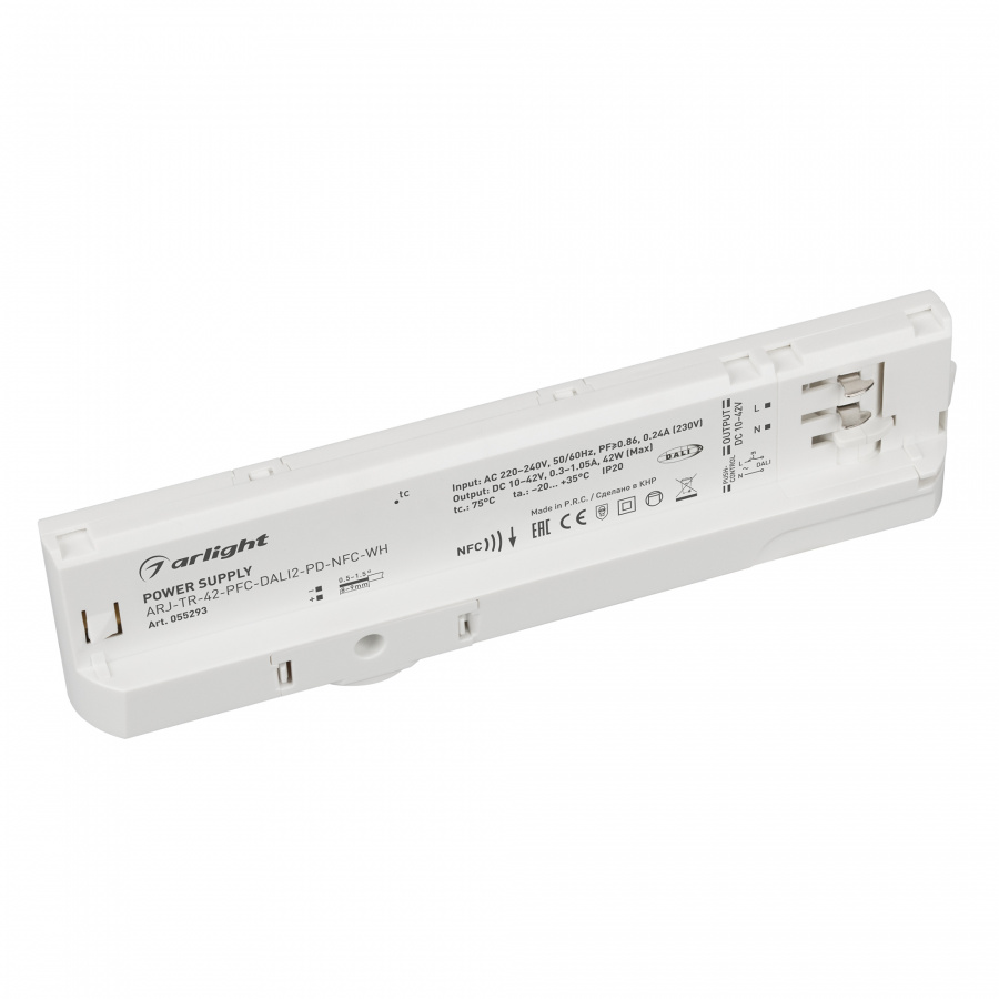 Цвет корпуса - белый. Предназначен для работы с 3-х фазной трековой системой (4+1 контакт). Питание 220-240VAC. Выходные параметры: 10-42В (300-800 мА); 10-40В (850-1050 мА), максимальная мощность 42 Вт. PF>0,86. Глубина диммирования (по протоколу DALI) 1-100% Пластиковый корпус IP20.