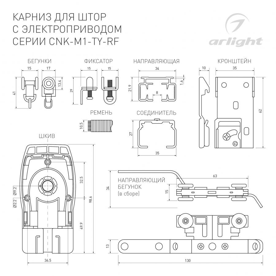 1 мотор, 1 пульт дистанционного управления, алюминиевый профиль 1,6 мм (1м - 3шт, 0.5м - 1шт, 0.2м - 2шт., 0.1м - 1 шт.), 3 соединителя 10 см, 1 соединитель 20 см, 1 переходник 5 см, 2 шкива, 2 пряжки ремня, 2 направляющих бегунка, ремень 8,4 м, 24 бегунка, 2 фиксатора, 8 кронштейнов, 1 зажим на ремень