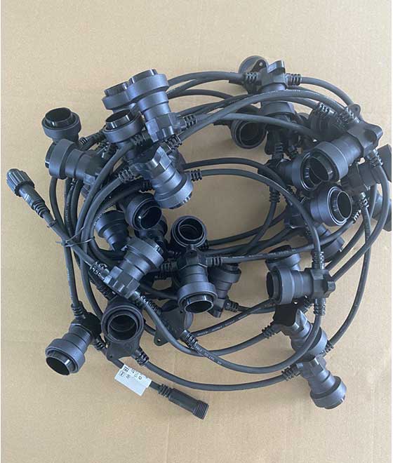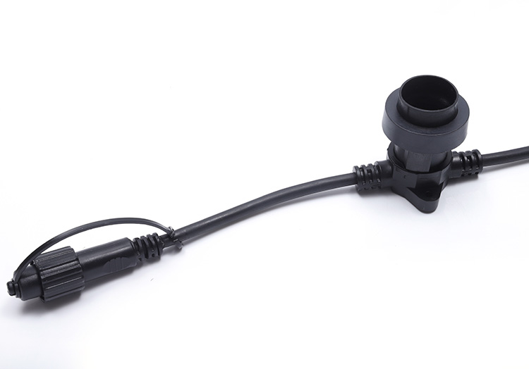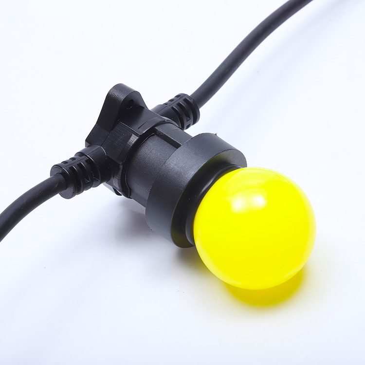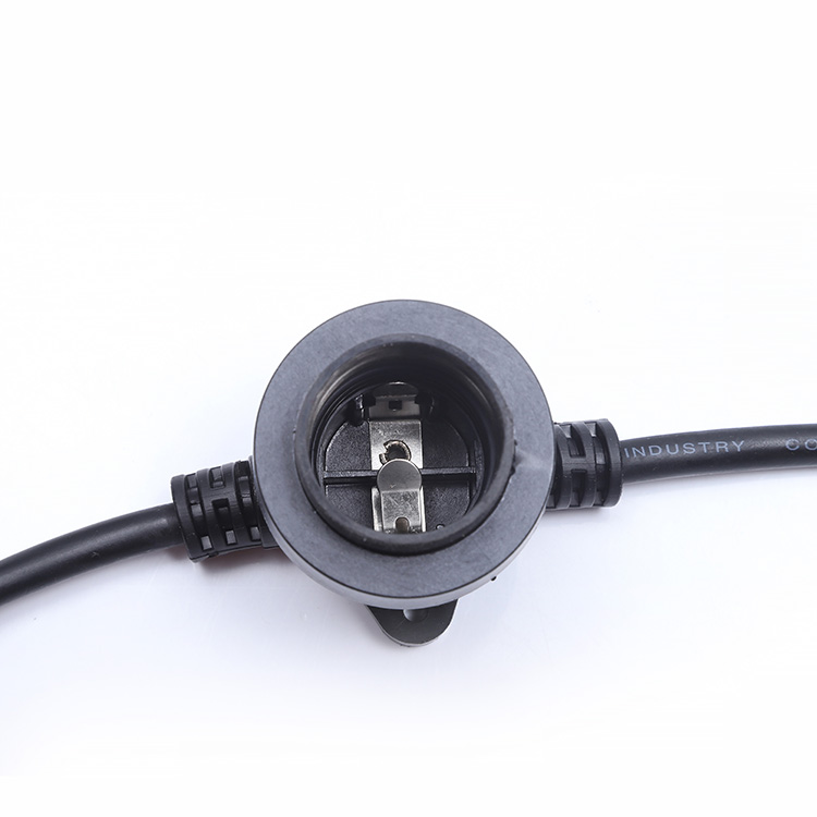 Данная гирлянда представляет из себя черный кабель длиной 10м с соединителями IN/OUT на концах. Гирлянда имеет 40шт. патронов с цоколем E27 со специальными креплениями для установки на плоскую поверхность (стену, потолок), расположенных на расстоянии 25см друг от друга.