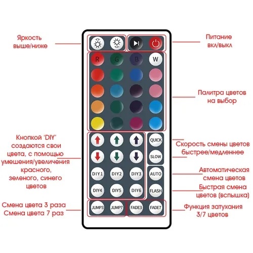 - Режимы работы пульта: Включение/выключение / Отдельная регулировка по каналам / Память последней настройки / Прямой выбор холодного белого цвета / Регулировка скорости / Регулировка яркости
