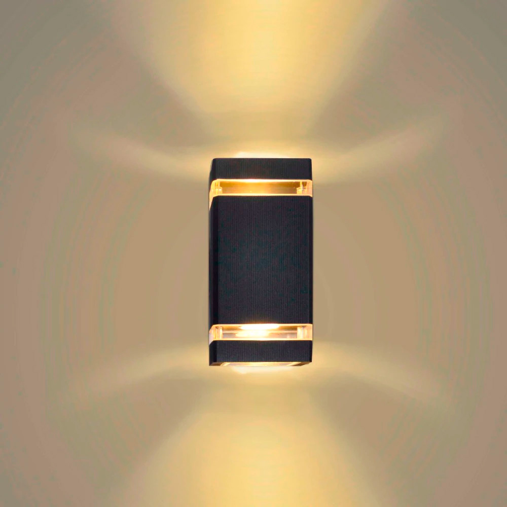 Корпус светильника изготовлен из алюминиевого сплава и поликарбоната. Прозрачные вставки в центре корпуса позволяют получать оригинальный световой рисунок на стене.