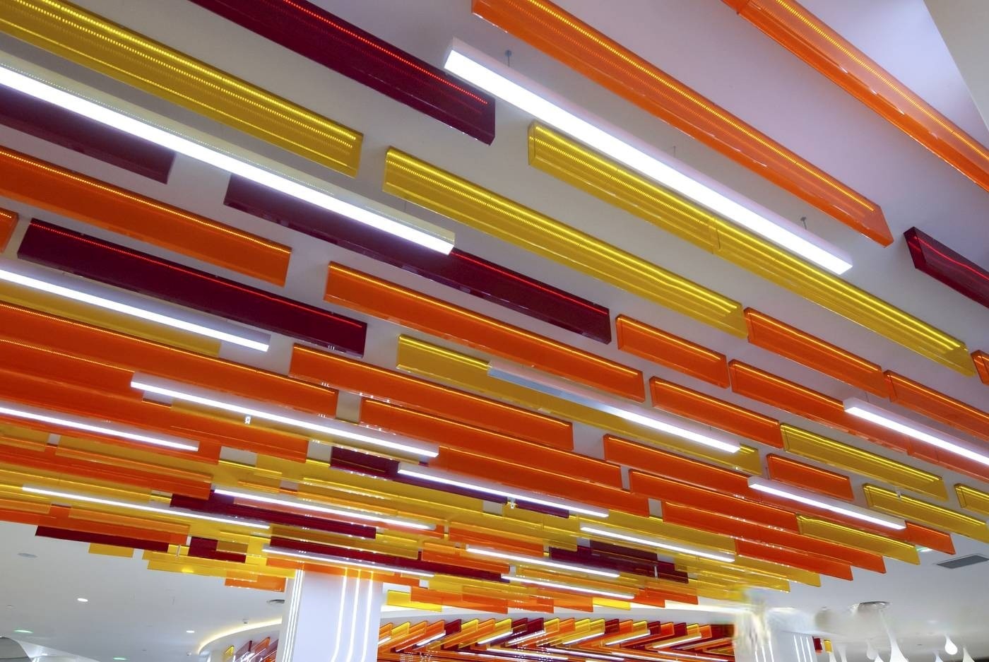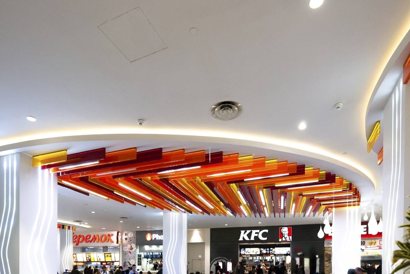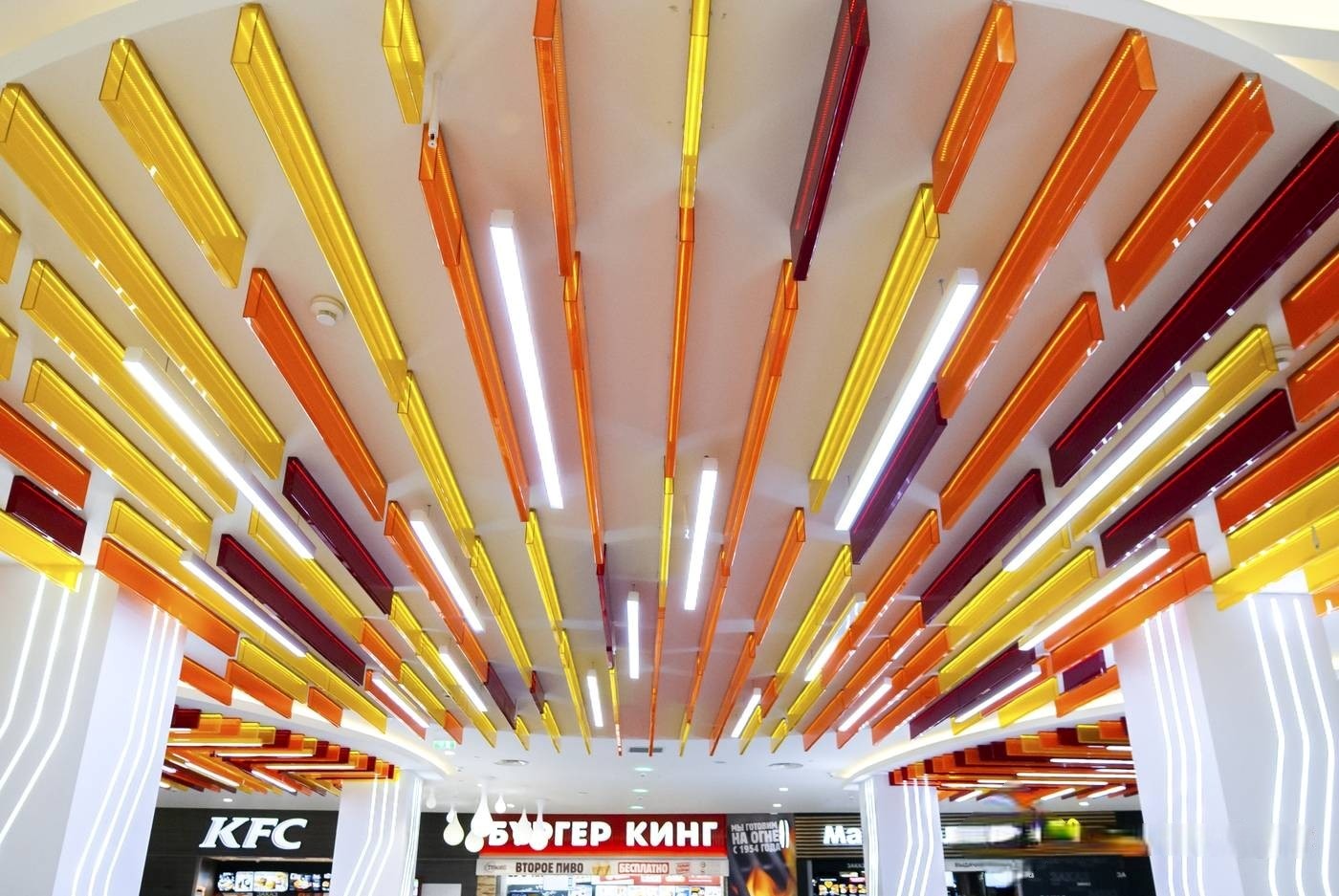 Нашими специалистами были изготовлены под заказ подвесные линейные светильники для зоны фудкорта.