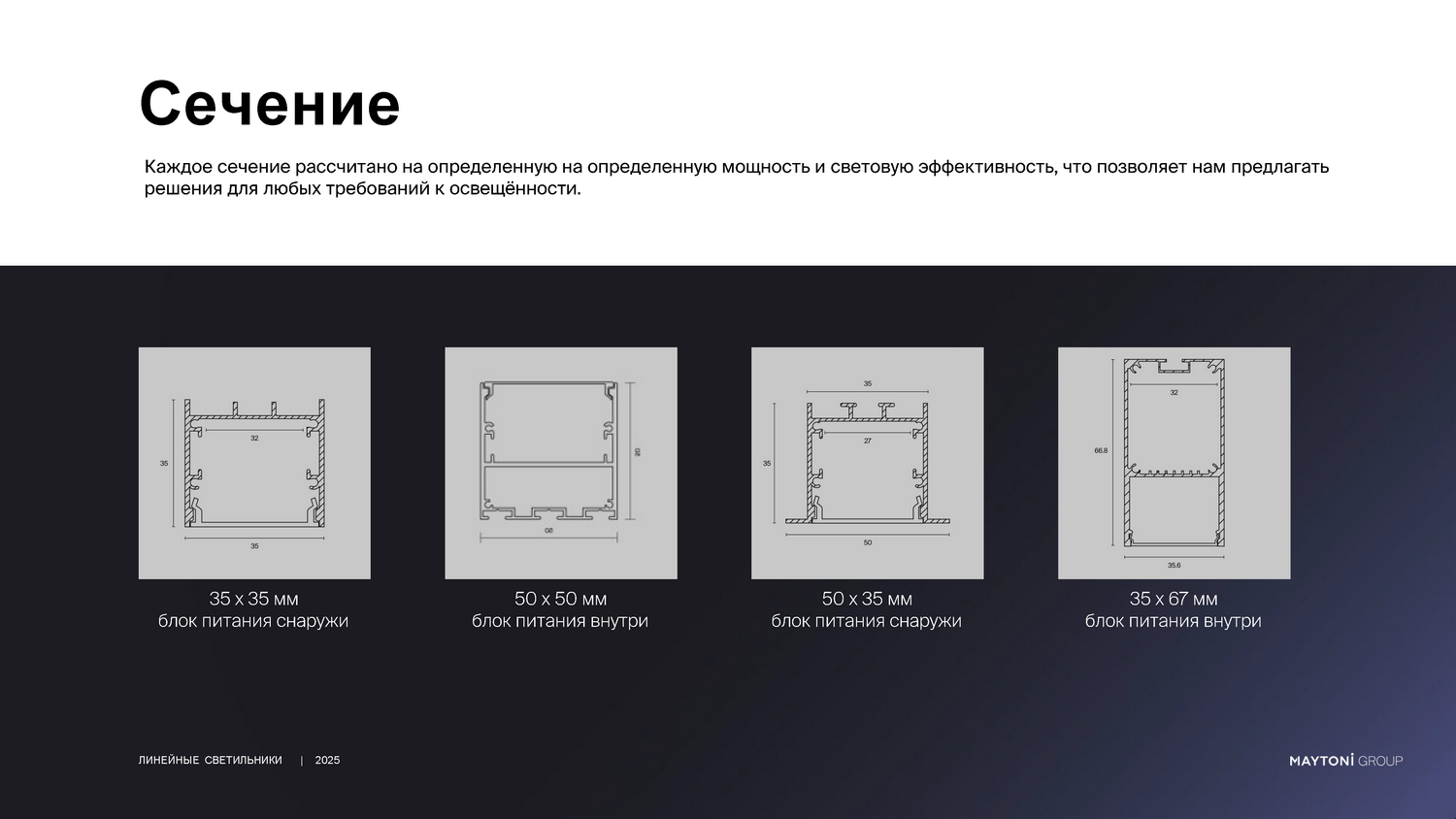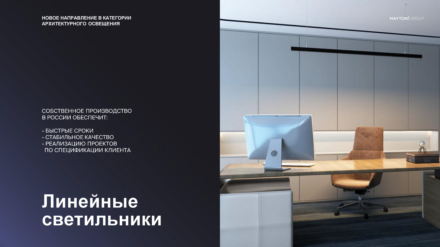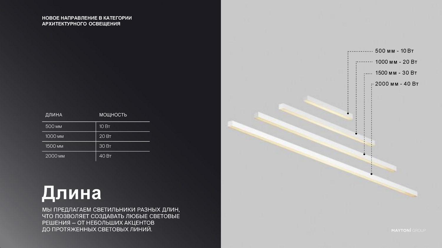 - Главное преимущество работы с нами — полная свобода проектирования. Мы предлагаем изготовление светильников под разную длину, что особенно важно для нестандартных планировок и дизайнерских решений, где не подходят готовые заводские размеры.
