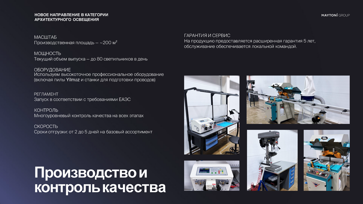 - Полный цикл производства. От разработки конструкции до финальной сборки — всё выполняется на собственном производстве, что позволяет гарантировать стабильное качество и оперативно вносить изменения по запросу клиента.