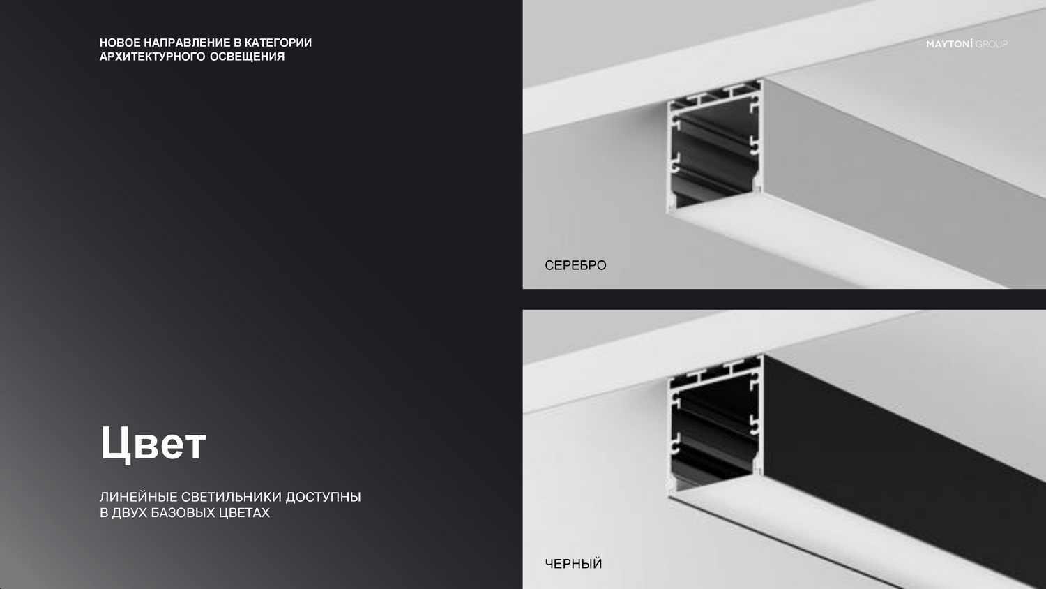 - Цвет линейного светильника — большой выбор цвета самого корпуса (белый, черный, серебристый, анодированный, а также покраска по RAL) позволяет сделать осветительный прибор незаметным или, наоборот, эффектным акцентом.