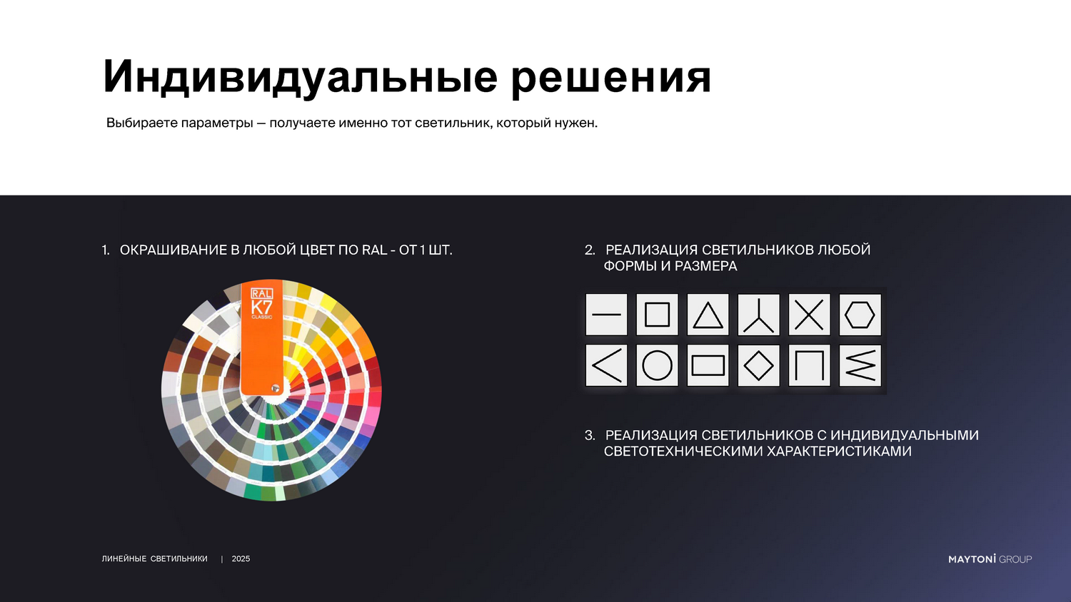 - Индивидуальный подход. Готовы реализовать нестандартные проекты: по вашему эскизу, чертежу или техническому заданию создадим уникальное световое решение.