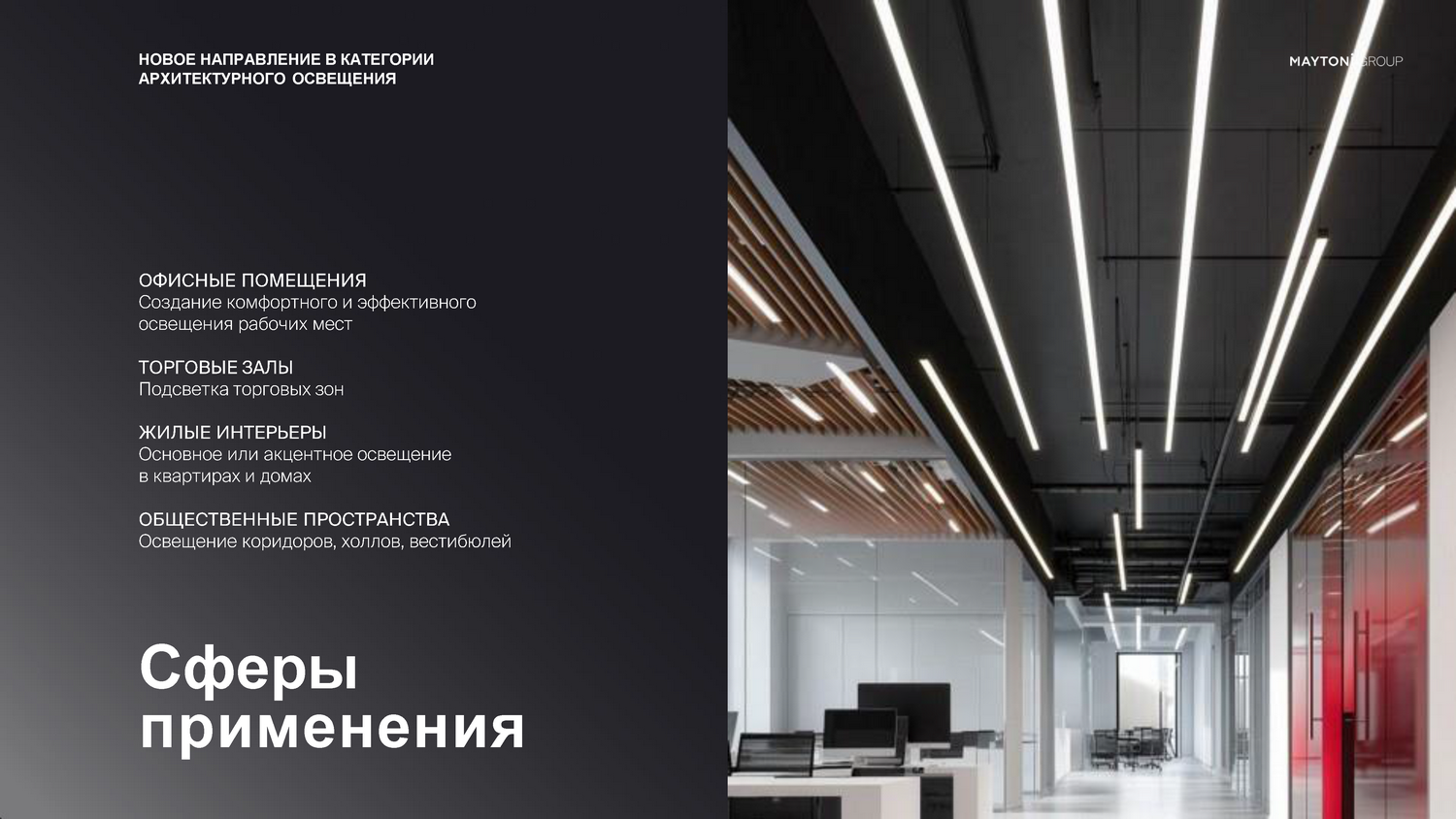 - Светильники для жилых интерьеров — воплощают современные дизайн-проекты: от подсветки потолков и панно до функционального зонирования пространства.