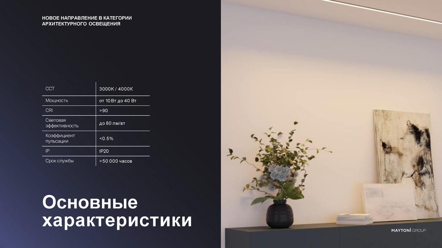 - Цветовую температуру — от теплого (3000К) до холодного бодрящего света (5000К+). Доступна любая градация для строгого соответствия концепции интерьера.